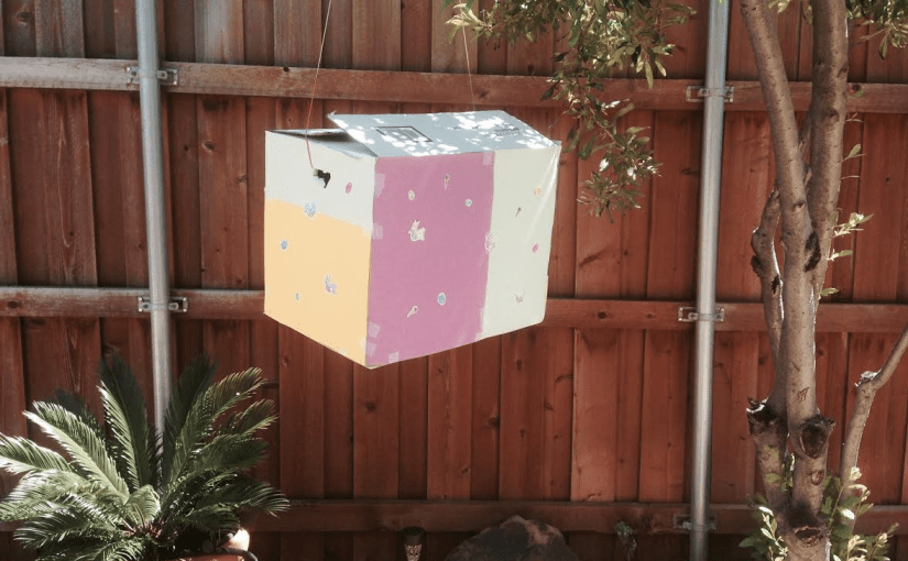 For Easter this year, we decided to turn a cardboard box into an Easter piñata. Ours is not elaborate, but it took us only 5 minutes to cover it with construction paper and decorate it with Easter stickers! You and your family can decorate yours for any event or holiday and make it as decorative as you want. You can use string, stickers, jewels, cutouts and all kinds of embellishments you already have at home. You don’t need to buy a new piñata at the store when you’ve got cardboard boxes laying around the house or garage that you can decorate and repurpose. Decorating your box to be a piñata is as much fun as whacking it with a stick to break it open for all the goodies inside!